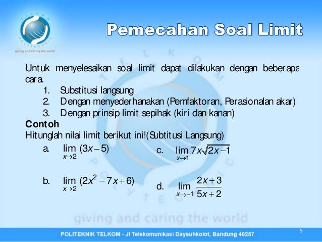 Maka, nilailimit fungsi aljabar tersebut adalah. Halaman ini memuat kumpulan soal limit fungsi trigonometri yang telah dilengkapi dengan pembahasan. (soal limit fungsi aljabar un 2012) pembahasan bentuk 0/0 juga, ubah bentuk akarnya ke bentuk pangkat agar lebih mudah cara pertama perkalian dengan sekawan dan pemfaktoran contoh berikutnya tipe soal limit yang berbentuk selisih akar kuadrat. Pembahasan soal limit fungsi aljabar soal limit dengan pemfaktoran contoh limit dengan substitusi contoh limit dengan membagi pangkat tertinggi soal limit untuk tak terhingga informasi serba definisi. Buatlah diagram lambang dari data berikut.