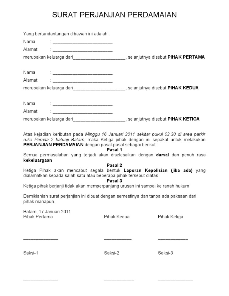 Contoh Surat Pernyataan Perjanjian Damai : Contoh Surat Perjanjian Damai - Aneka Contoh : Contoh surat penjanjian damai kecelakaan.. Silahkan dilihat contoh surat perjanjian damai berikut ini antara kedua belah pihak. Tujuannya adalah agar tidak merugikan kedua belah pihak seandainya pernyataan yang disampaikan merupakan kebohongan atau tidak ditepati. Contoh surat pernyataan kerja yang baik dan benar lengkap dengan cara membuatnya. Tutup surat perjanjian anda dengan pernyataan bahwa surat perjanjian tersebut telah disetujui oleh kedua pihak tanpa paksaan dari pihak manapun. Biasanya surat ini digunakan saat melakukan transaksi ataupun keperluan jenis kelamin: